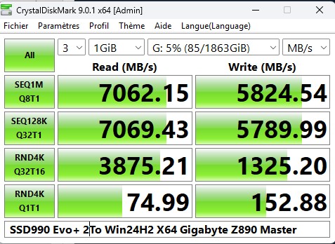 Asus Z890 ProArt, Intel Cpu Core Ultra 7 265K, Memoires 32Go Corsair DDR5 (6000Mhz CL30), Water-cooling Thermaright, nVidia Geforce RTX4060, Alimentation Gigabyte 850W, Samsung SSD 990 Pro, SSD9100 Pro, Steelserie Pro , Souris Razer, Boitier HUMMER, HP Steelserie, Free Fibre Ultra (8Go/8Go), Lan 10Gb, Cable CAT8/7, Switch 10/5/2.5Gbps, Casque Philips Fedelis.