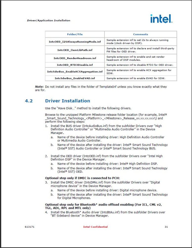 il y a 7 mois 3 semaines - il y a 7 mois 3 semainesThere's other hidden .inf that Intel intentionally aren't sharing , a PDF on page 30 which lists out other .inf files related to Intel SST (I got as well lots of other secret Intel files that got leaked out & collected throughout the internet) , hopefully I'm not breaking forum rules. here's a screenshot of the page from the PDF if you wanna know the list of other Intel SST .inf files.How you get the IntcOED_RenderHeadroom.inf (INF code pastebin.com/raw/bDTuBUsp )? I can't find any update of this Extension in google/ddg results.