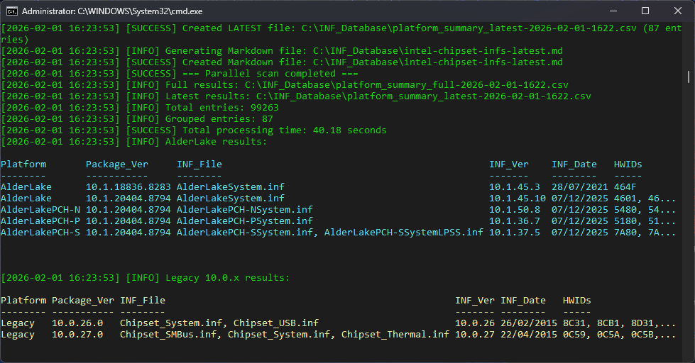 - Generates: intel-chipset-infs-latest-v2.md (hardware-correct) and installer-list.csv