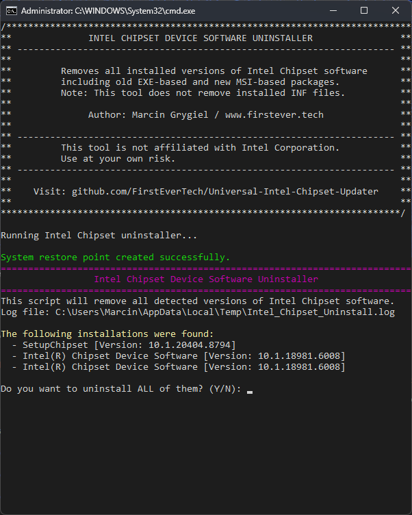 - Logs all actions to %TEMP%\Intel_Chipset_Uninstall.log