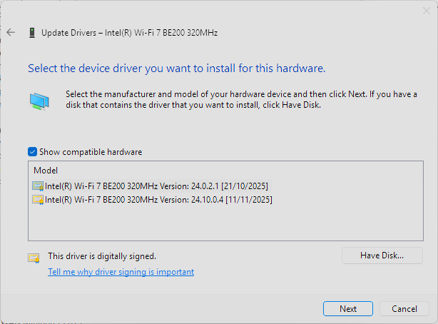 Official Release of v24.10.0.4 of the Intel® Wireless WiFi Software and Driver on December 23, 2025