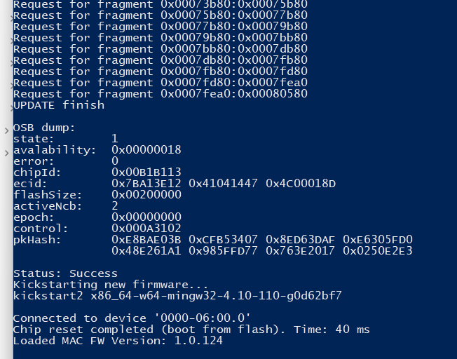 Code:Getting four part IDs... Read four part IDs from the device: 0x1D6A (VID), 0x14C0 (DID), 0x1D6A (SVID), 0x0001 (SDID) Deleting the existing updated.clx file... Updating the clx file... ./customclx2 0x1D6A 0x14C0 0x1D6A 0x0001 updatedata.xml updated.clx exprom :1 Image Name :AQC113-Antigua_Bx-1.3.36_bdp_aqsign.clx macBdpLen :32 phyBdpLen :28 Custom clx generated updated.clx Flashing the device with updated.clx... flashUpdate2 x86_64-w64-mingw32-4.10-110-g0d62bf7 Connected to device '0000-05:00.0' Starting hostboot (requested by user)... Chip reset completed (boot from host). Time: 400 ms Success load UpdateAgent UPDATE start Request for fragment 0x00000000:0x00001800 Request for fragment 0x00003000:0x00005000 Request for fragment 0x00005000:0x00007000 Request for fragment 0x00007000:0x00009000 Request for fragment 0x00009000:0x0000b000 Request for fragment 0x0000b000:0x0000d000 Request for fragment 0x0000d000:0x0000f000 Request for fragment 0x0000f000:0x00011000 Request for fragment 0x00011000:0x00013000 Request for fragment 0x00013000:0x00015000 Request for fragment 0x00015000:0x00017000 Request for fragment 0x00017000:0x00019000 Request for fragment 0x00019000:0x0001b000 Request for fragment 0x0001b000:0x0001d000 Request for fragment 0x0001d000:0x0001f000 Request for fragment 0x0001f000:0x00021000 Request for fragment 0x00021000:0x00021d10 Request for fragment 0x00021d40:0x00023d40 Request for fragment 0x00023d40:0x00025d40 Request for fragment 0x00025d40:0x00027d40 Request for fragment 0x00027d40:0x00029d40 Request for fragment 0x00029d40:0x0002bd40 Request for fragment 0x0002bd40:0x0002dd40 Request for fragment 0x0002dd40:0x0002fd40 Request for fragment 0x0002fd40:0x00031d40 Request for fragment 0x00031d40:0x00033d40 Request for fragment 0x00033d40:0x00035d40 Request for fragment 0x00035d40:0x00037d40 Request for fragment 0x00037d40:0x00039d40 Request for fragment 0x00039d40:0x0003bd40 Request for fragment 0x0003bd40:0x0003dd40 Request for fragment 0x0003dd40:0x0003fd40 Request for fragment 0x0003fd40:0x00041d40 Request for fragment 0x00041d40:0x00043d40 Request for fragment 0x00043d40:0x00045d40 Request for fragment 0x00045d40:0x00047d40 Request for fragment 0x00047d40:0x00049d40 Request for fragment 0x00049d40:0x0004bd40 Request for fragment 0x0004bd40:0x0004dd40 Request for fragment 0x0004dd40:0x0004fd40 Request for fragment 0x0004fd40:0x00051d40 Request for fragment 0x00051d40:0x00053d40 Request for fragment 0x00053d40:0x00055d40 Request for fragment 0x00055d40:0x00057d40 Request for fragment 0x00057d40:0x00059d40 Request for fragment 0x00059d40:0x0005bd40 Request for fragment 0x0005bd40:0x0005dd40 Request for fragment 0x0005dd40:0x0005fd40 Request for fragment 0x0005fd40:0x00061d40 Request for fragment 0x00061d40:0x00063d40 Request for fragment 0x00063d40:0x00065d40 Request for fragment 0x00065d40:0x00067d40 Request for fragment 0x00067d40:0x00069d40 Request for fragment 0x00069d40:0x0006bd40 Request for fragment 0x0006bd40:0x0006db64 Request for fragment 0x0006db80:0x0006fb80 Request for fragment 0x0006fb80:0x00071b80 Request for fragment 0x00071b80:0x00073b80 Request for fragment 0x00073b80:0x00075b80 Request for fragment 0x00075b80:0x00077b80 Request for fragment 0x00077b80:0x00079b80 Request for fragment 0x00079b80:0x0007bb80 Request for fragment 0x0007bb80:0x0007db80 Request for fragment 0x0007db80:0x0007fb80 Request for fragment 0x0007fb80:0x0007fd80 Request for fragment 0x0007fd80:0x0007fea0 Request for fragment 0x0007fea0:0x00080580 UPDATE finish OSB dump: state: 1 avalability: 0x00000078 error: 0 chipId: 0x00B1A113 ecid: 0x6BA10D38 0x61141553 0x48000168 flashSize: 0x00200000 activeNcb: 1 epoch: 0x00000000 control: 0x00020000 pkHash: 0x00000000 0x00000000 0x00000000 0x00000000 0x00000000 0x00000000 0x00000000 0x00000000 Status: Success Kickstarting new firmware... kickstart2 x86_64-w64-mingw32-4.10-110-g0d62bf7 Connected to device '0000-05:00.0' Error: MAC firmware is not started. Reset status = 0x15000000 PS D:\1>