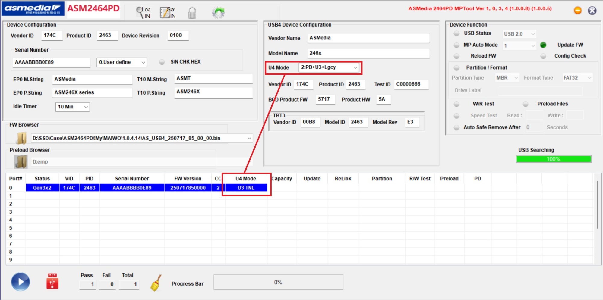 Tried upgrading as well as downgrading ASM2464 frimware. I also tried downgrading BIOS, changing cables. But this is USB4 port problem.