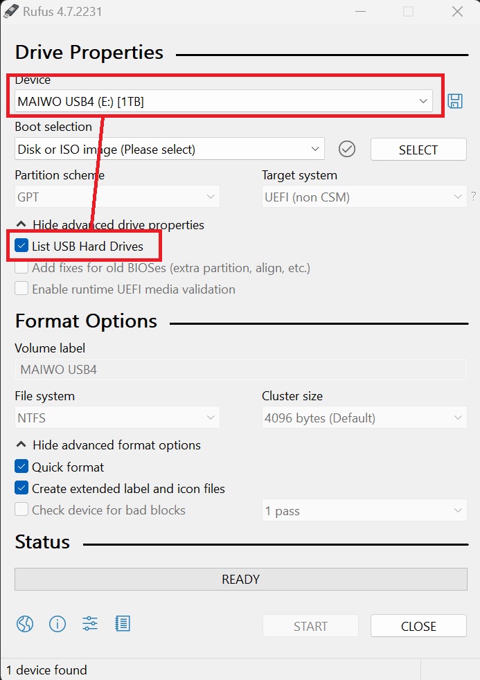 Hello, I have ShuoLe ASM2464 NVMe enclosure from Aliexpress. I inserted Crucial P3 2TB Plus into it. Works damn good. But if I connect it to USB 4 port of my Asus X870E ProArt motherboard, Rufus cannot detect the external drive. It only gets detected when connected to USB 3.2 20G or 10G ports. I checked the USB drives option in Rufus.