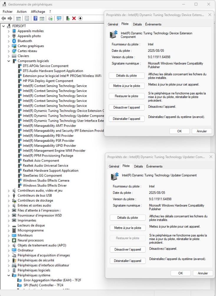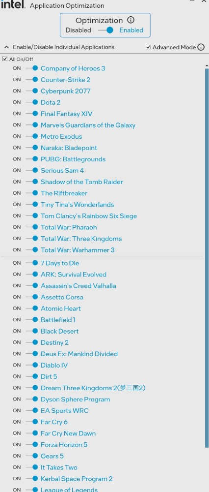 Intel® Iris Xe MAX Graphics or Intel® Arc Graphics Source Intel: www.intel.fr/content/www/fr/fr/support/a...058479/graphics.html Overview Intel® Application Optimization determines and directs application resources in real time. This policy optimizes thread scheduling along with application threading for selected software titles and may improve performance for supported applications. System responsiveness may vary based on configuration and graphics card capabilities. Users can disable Intel Application Optimization through this software for all applications or on a per application basis if results are not as expected.Intel Application Optimizer user interface is an optional part of the optimization technology that allows users to see what games are optimized and to turn off optimizations they do not want. Users may disable the entire application or disable specific games under Enable/Disable Individual Applications tab. The list will vary from user to user, depending on the games detected and optimized by Intel®. More applications / games will be supported by Intel Application Optimization during regular updates in future.Intel® Application Optimization Requirements Supported Intel® Core™ Desktop and Mobile Processors with at least 6 p-cores or more. Verified processors are listed in the below section. All other Intel® Core™ processors 12th gen and newer that are not listed in verified list have limited support and can only be used with Advanced Mode , which requires Intel® DTT version 11405 or later. BIOS enablement and installation of Intel® Dynamic Tuning Technology (Intel® DTT) . Intel® DTT is available through your motherboard system manufacturer . Most motherboard system manufacturers will have Intel® Platform Innovation Framework (Intel® IPF), enabled in BIOS by default. Older systems may require the end user to enable this option in BIOS manually, it may also be called Intel® Dynamic Tuning Technology (Intel® DTT). Source Intel: Intel® Application Optimization Overview