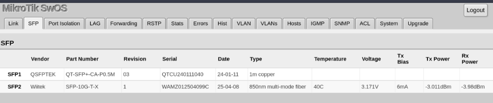 On the switch side I only have 40C on the SFP+ module and 38C on the CPU. (I have added case fans to the switch which helps tremendously for this model)