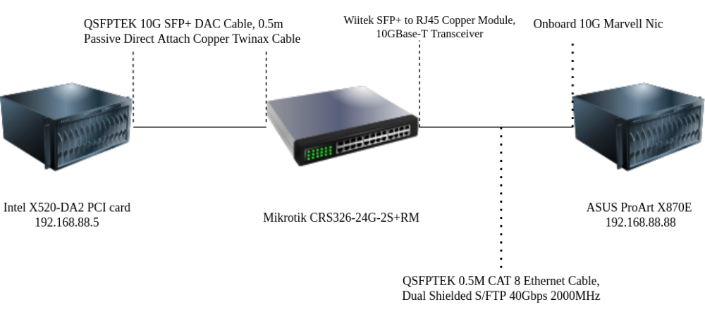 I just did a test where I circumvented the switch and plugged the Wiitek SFP+ module directly into the Intel X520-DA2 on the other server and connected it with a CAT6 cable to my ProArt X870E 10G AQC113C Onboard NIC.