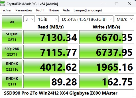 Asus Z890 ProArt, Intel Cpu Core Ultra 7 265K, Memoires 32Go Corsair DDR5 (6000Mhz CL30), Water-cooling Thermaright, nVidia Geforce RTX4060, Alimentation Gigabyte 850W, Samsung SSD 990 Pro, SSD9100 Pro, Steelserie Pro , Souris Razer, Boitier HUMMER, HP Steelserie, Free Fibre Ultra (8Go/8Go), Lan 10Gb, Cable CAT8/7, Switch 10/5/2.5Gbps, Casque Philips Fedelis.