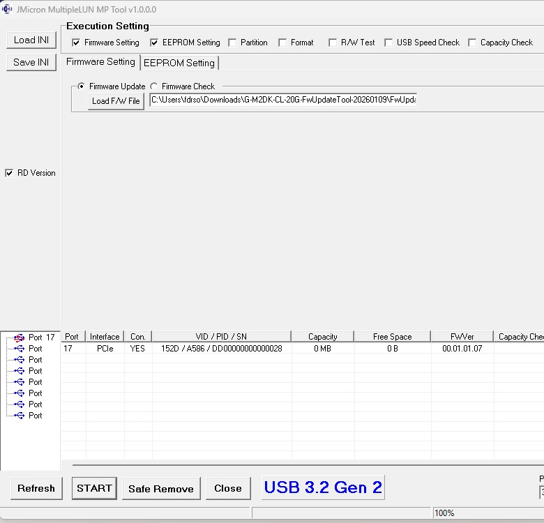 Jmicron JMS-586 NVMe/USB 3.2 Controller firmware Version 00.01.01.07