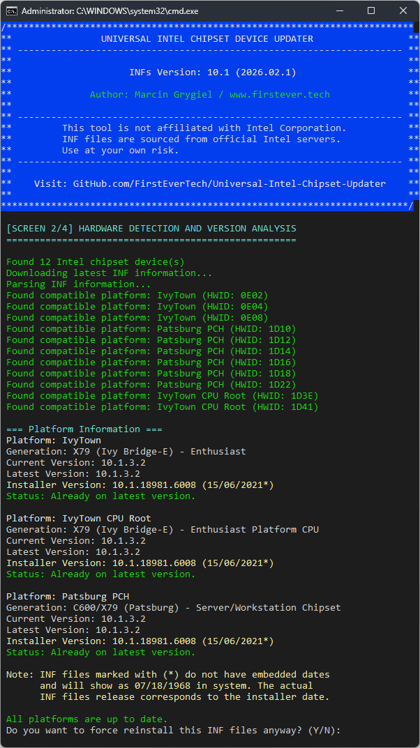 Intel's official Chipset Device Software has evolved over 25 years into a complex, bloated package. This tool simplifies the process by automatically detecting and installing only the INF files your system actually needs — nothing more, nothing less.